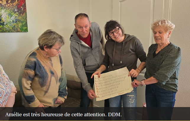 Vendredi 23 janvier, plusieurs personnes se sont donc retrouvées au Comtal pour remettre quelques cadeaux à Amélie ; un de ses superbes poèmes "Aurignac sous la neige", qu’elle a présenté lors du dernier atelier d’écriture, a été calligraphié par Isabelle passionnée par cet art, et offert à Amélie, très émue et honorée, ainsi qu’une création des petites mains des « Amis de la Lecture » faite au moyen d’un livre (à mettre au rebut) décoré et mis en valeur un cadeau magnifique qui a tiré les larmes de la jeune Amélie. Ensuite, elle a lu un autre de ses poèmes intitulé "Sourire" : le décor était planté ! Ses copines et copains du Comtal étaient présents et tout le monde a souhaité bon vent à cette jeune femme très attachante.